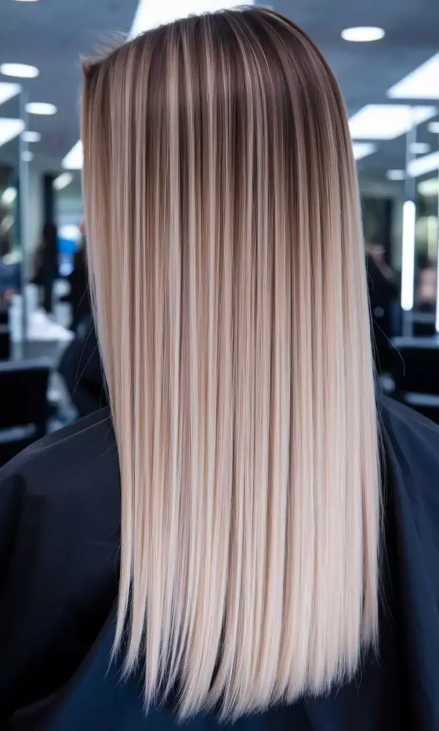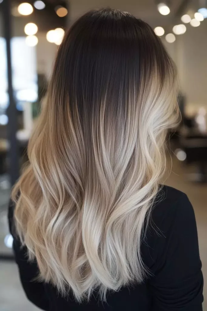 Cool blonde balayage on ash brown hair creates a stunning contrast. The balayage technique blends the colors naturally and adds brightness to the hair. This style feels modern, stylish, and very dimensional. It’s a popular trend among women who love fashionable hair colors. The blonde pieces also make the hairstyle look lighter. This gives a beautiful sun-lit effect.