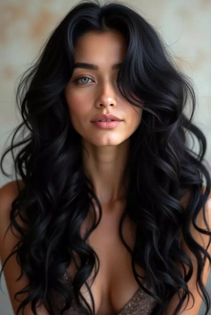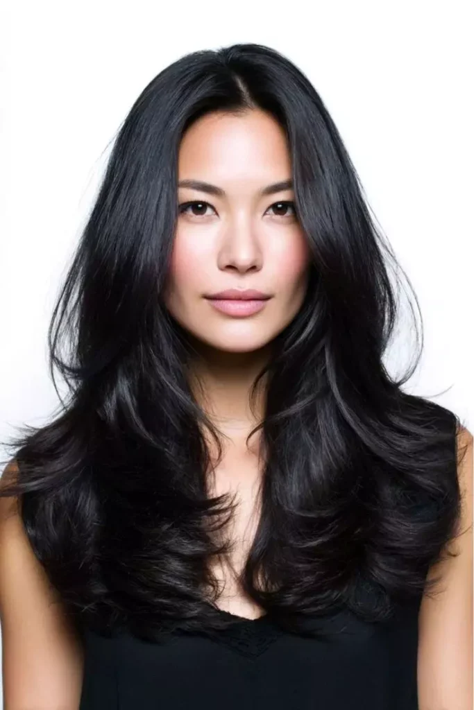 Long black hair with layers adds volume and natural flow. The layers create dimension, making thick black hair easier to style while looking elegant. This black hair style works perfectly with curls, waves, or straight strands for versatile styling options.