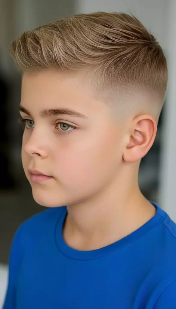 Short haircuts like buzz cuts, crew cuts, and simple fades are low-maintenance. They require minimal styling and are perfect for active boys or school routines.