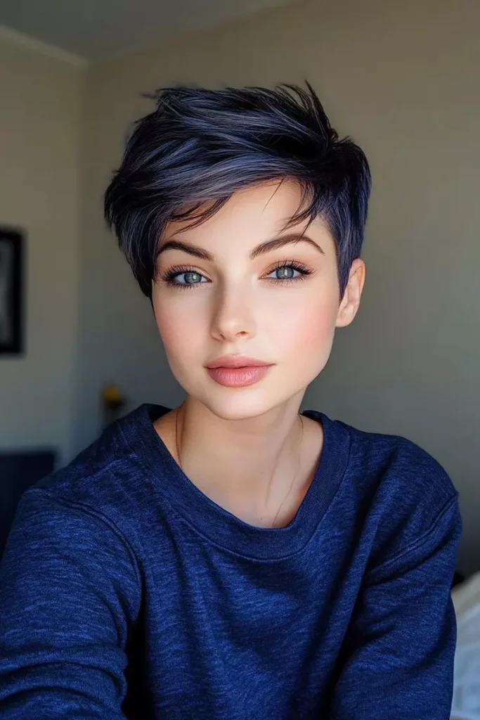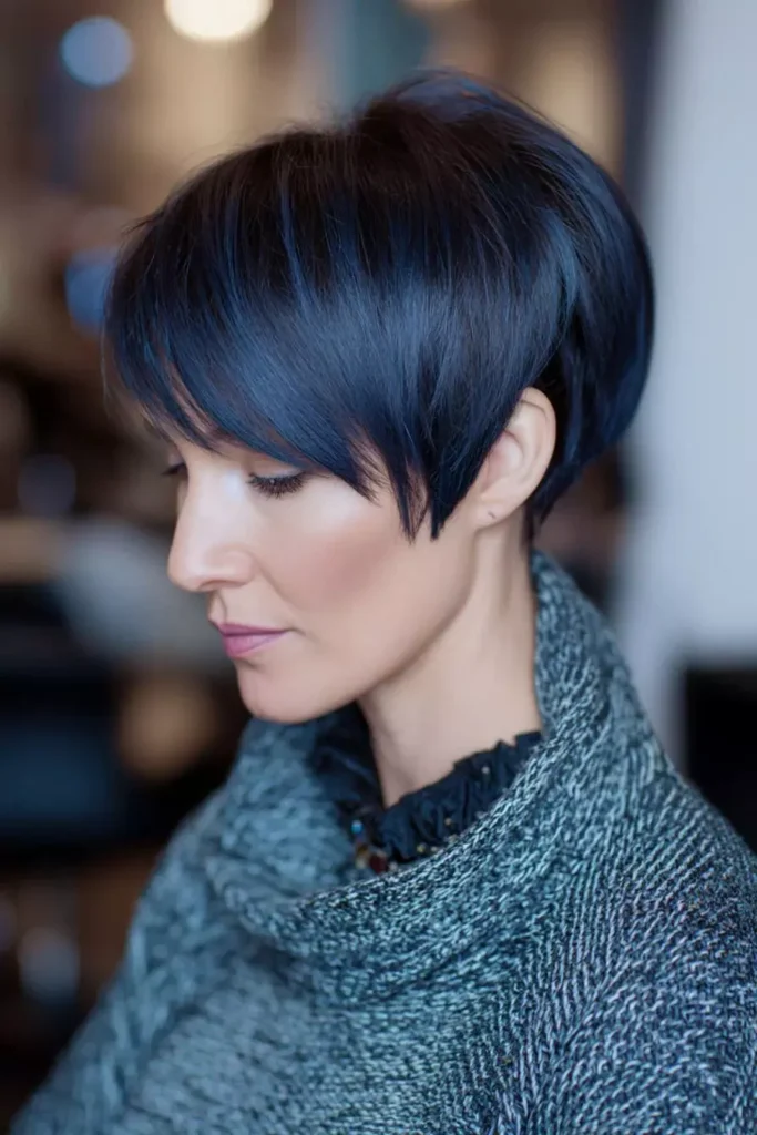 Stay ahead in style with trendy short dark blue hair looks. Bold colors never go out of fashion. Combine the shade with current haircut trends like pixie cuts or bob styles. Highlight layers for extra dimension. Using color-enhancing shampoos keeps the blue tone fresh and lively. This hairstyle can be paired with bold makeup for an edgy look. Adding subtle streaks of lighter blue makes the style more dynamic.