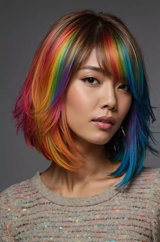 Rainbow hair is one of the boldest and most artistic hair dye ideas. It involves combining multiple bright colors such as pink, blue, green, purple, and yellow to create a vibrant and playful look.