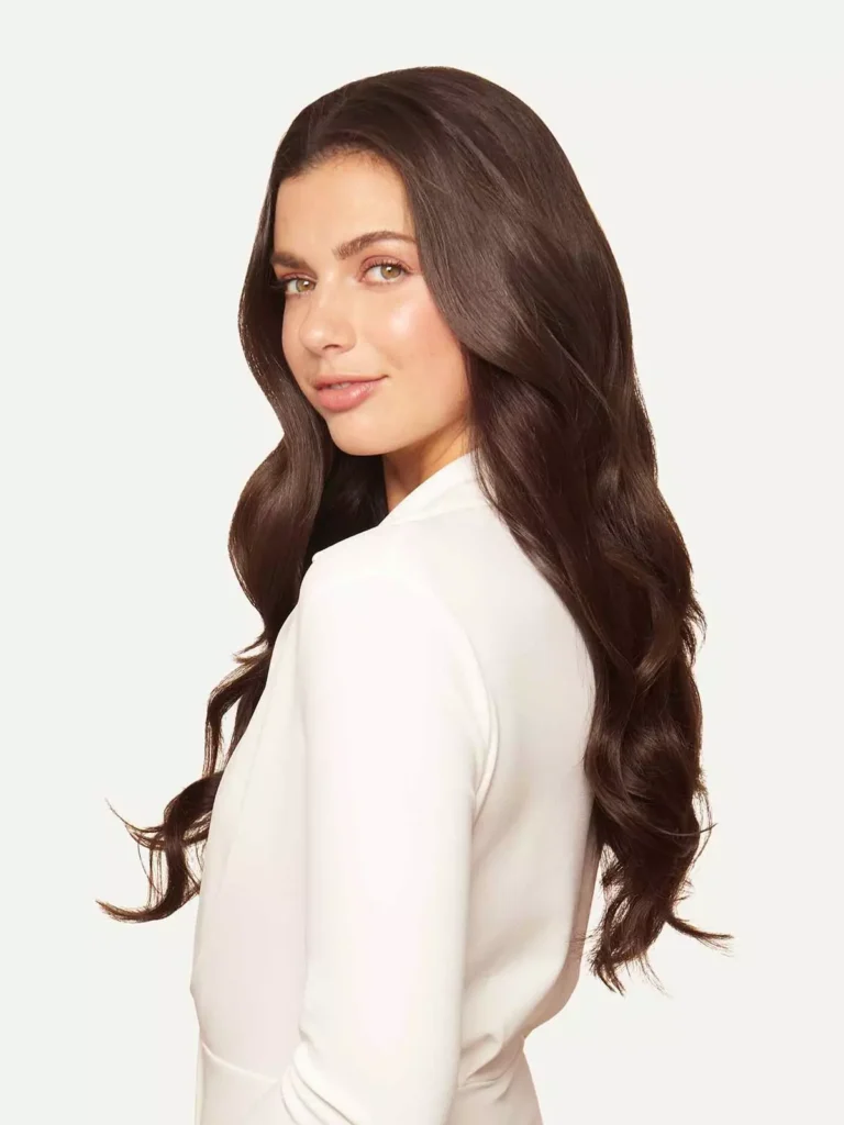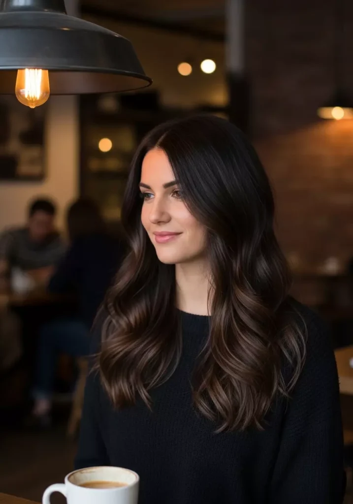 Dark chocolate hair with lighter highlights adds depth and movement to the hair. The contrast between the dark base and lighter strands creates a dimensional and sophisticated look.