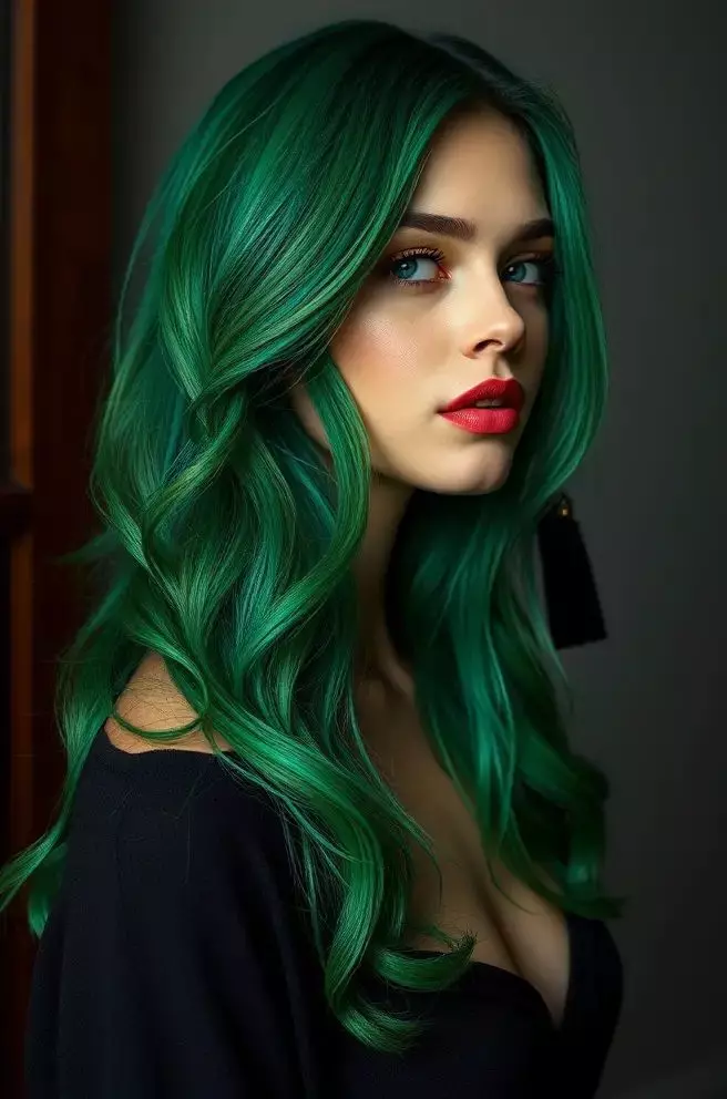 Emerald green hair is a bold and luxurious shade inspired by the rich color of precious gemstones. This deep green tone creates a dramatic and eye-catching appearance.