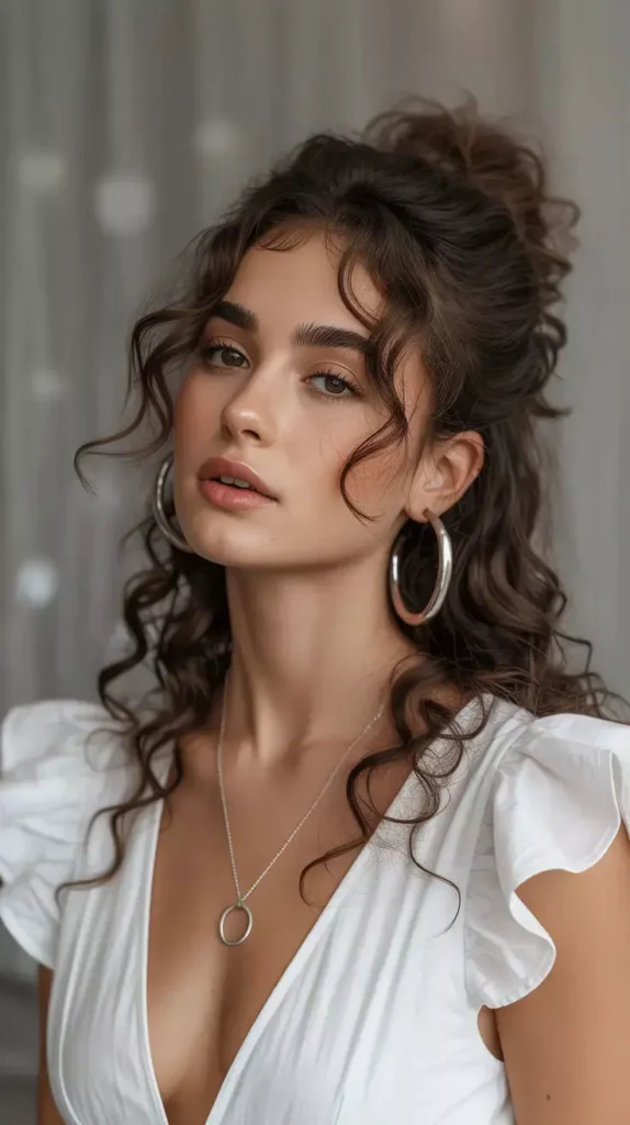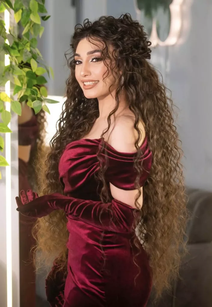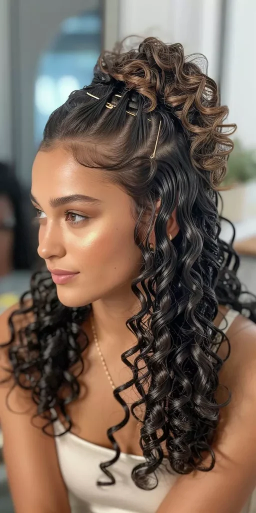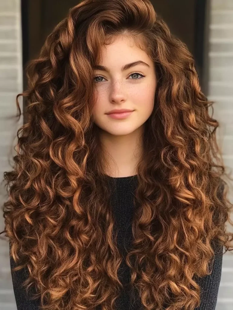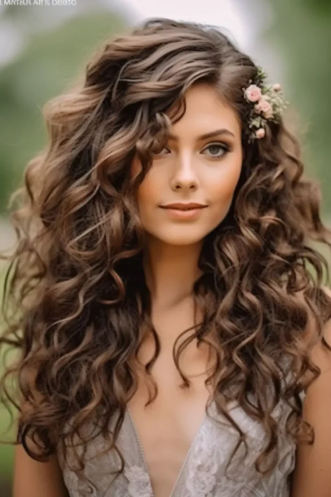 Elegant long curly hairstyles are suitable for formal events and parties. Soft curls, sleek layers, and polished updos exude sophistication. Accessories like clips or pins add a touch of glamour. This hairstyle emphasizes healthy shine and curl definition. It’s perfect for weddings, proms, or elegant evenings.
