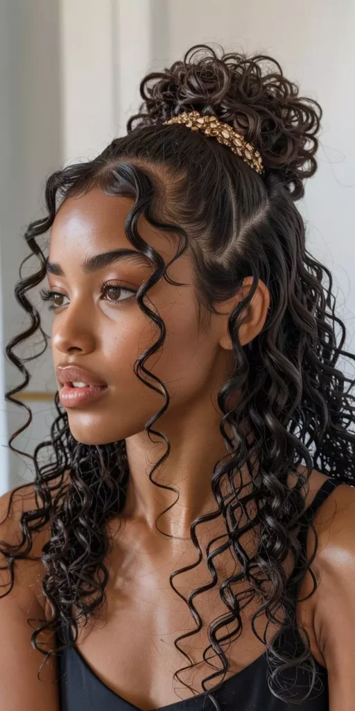 Romantic long curly hairstyles feature soft waves, curls, and gentle twists. Half-up hairstyles or braided accents enhance the romantic vibe. These styles are perfect for dates, weddings, or evening outings. Subtle highlights add depth and shine to curls. Romantic curls create a feminine and graceful appearance.
