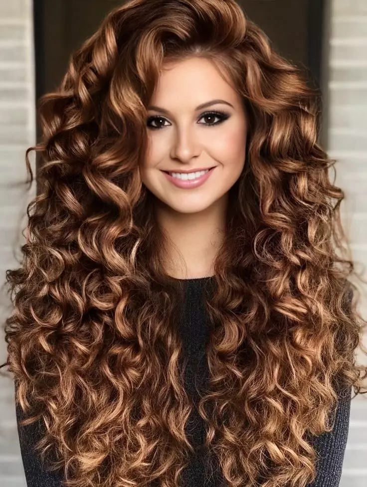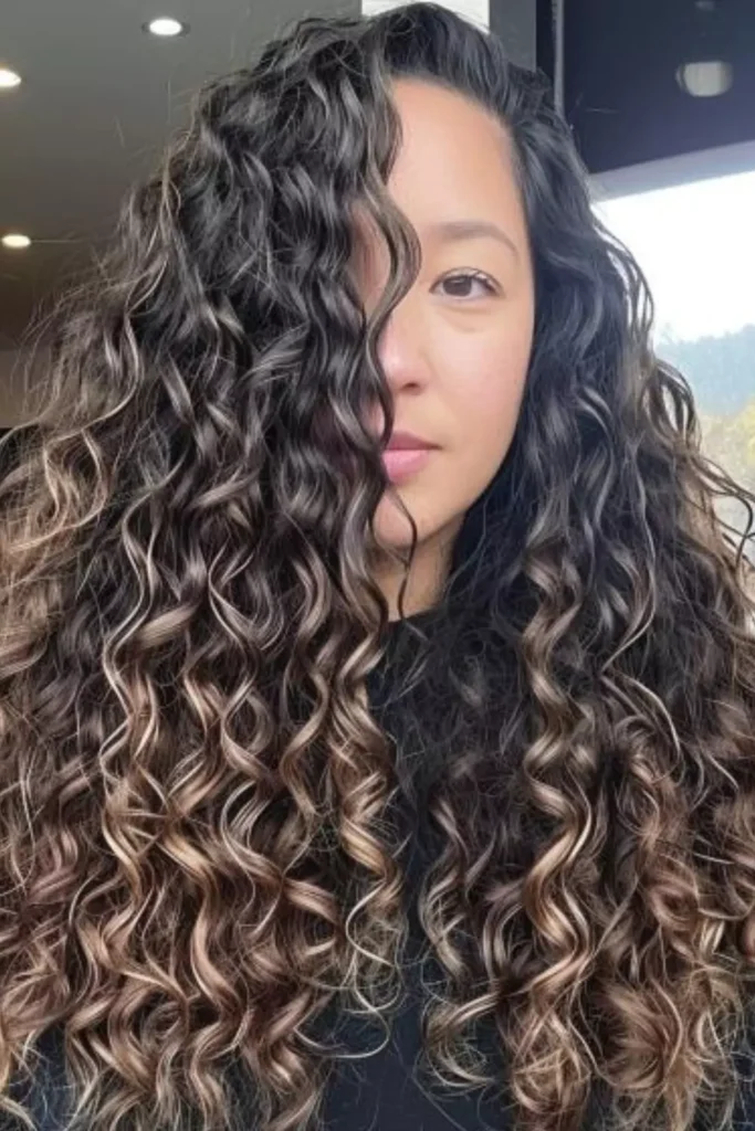 Highlighted long curly hairstyles add dimension and depth to natural curls. Balayage, ombre, or subtle highlights brighten hair while maintaining curl patterns. Highlights emphasize movement and layers. Proper care prevents fading and keeps curls vibrant. Highlighted curls create a stylish, modern look.