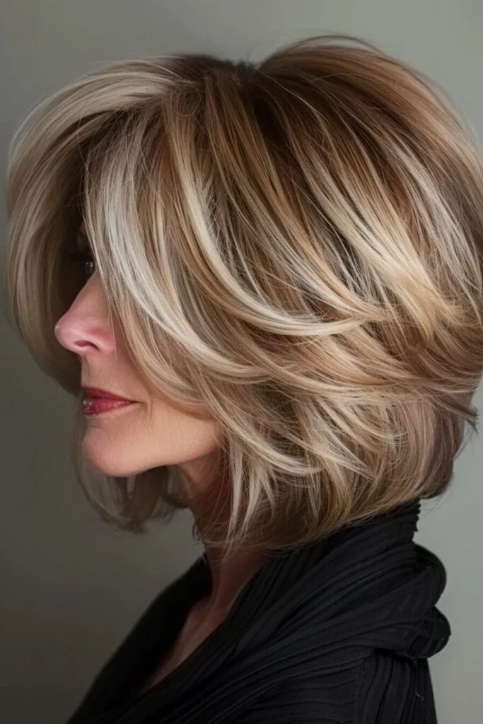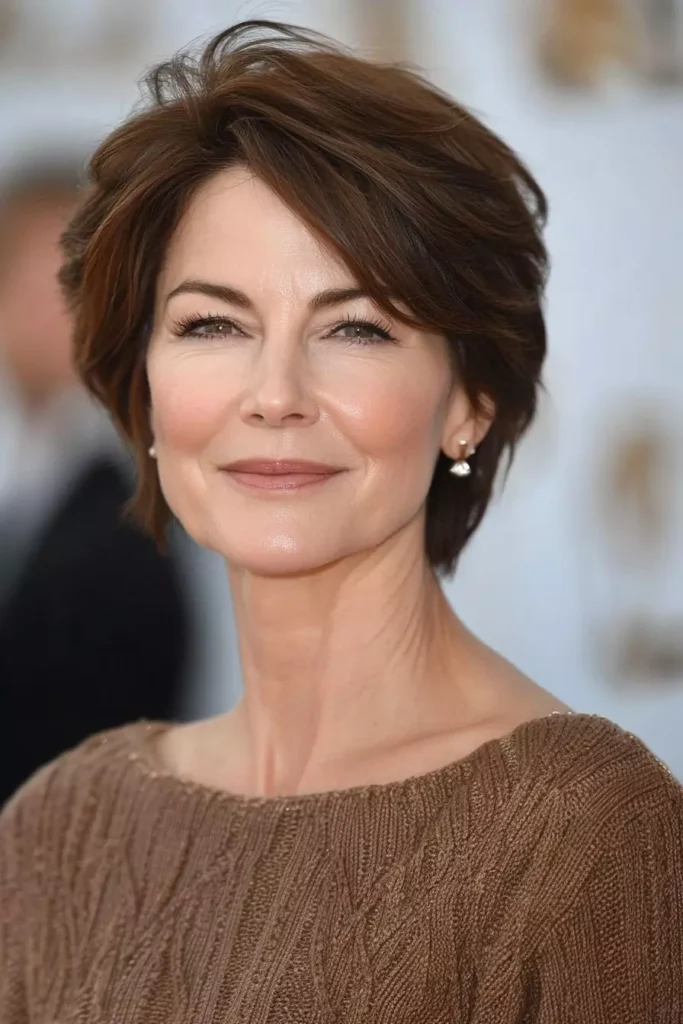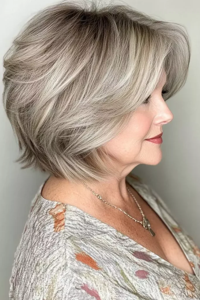 Layered hairstyles are perfect for short hair over 60 to add texture and movement. Layers prevent hair from looking flat and make fine hair appear fuller. Soft or choppy layers can create different visual effects. Short hair over 60 with layers is versatile and suitable for multiple face shapes. Styling options include tousled waves, sleek straight hair, or gentle curls.