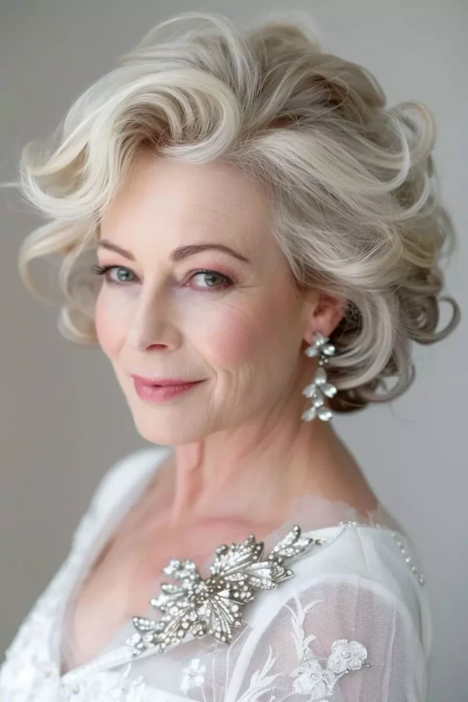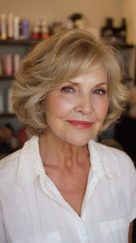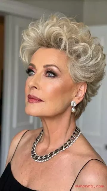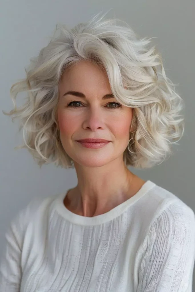 Wavy short hair over 60 adds texture and movement effortlessly. Loose waves or beachy styles work well with bobs and pixies. Wavy hairstyles create a soft and feminine look for mature women. Short hair over 60 with waves can be styled casually or for special occasions. Light layering enhances the natural wave pattern, keeping the hair lively and voluminous.