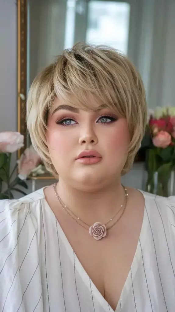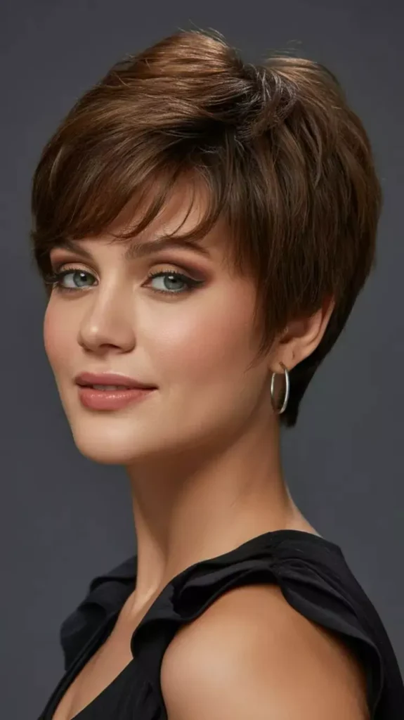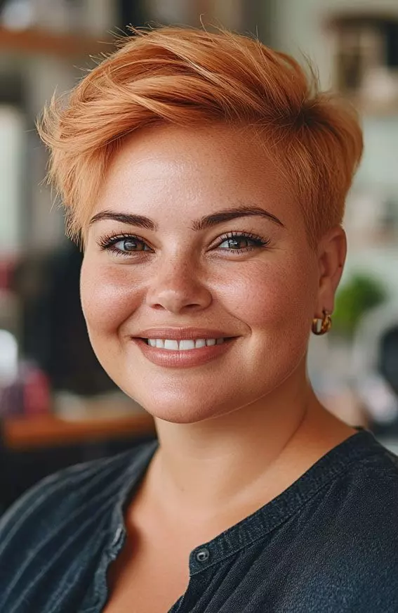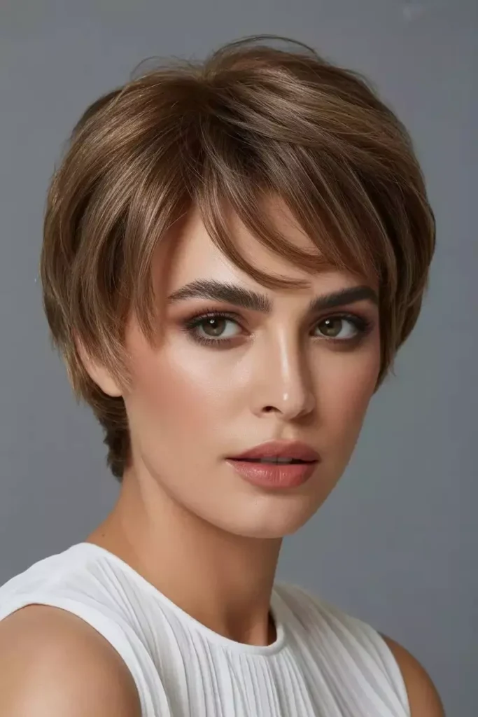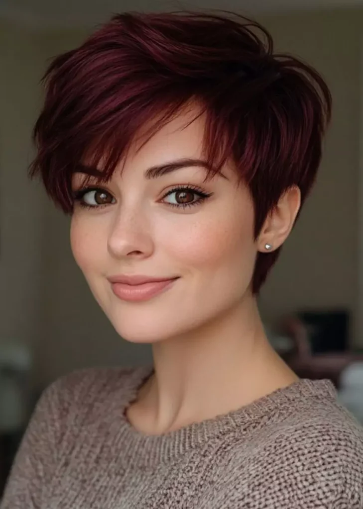 Modern pixie hairstyles combine boldness with simplicity. By adding layers and volume at the crown, this haircut helps balance the proportions of a round face. It is a great choice for those who want a low-maintenance yet fashionable hairstyle, and this style highlights facial features beautifully.