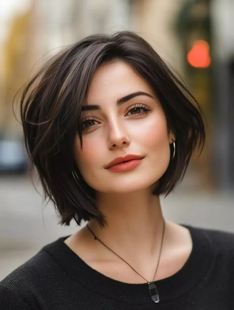 Chin length haircuts can be flattering for round faces when styled with layers or angles. Slightly longer front pieces help create a slimming effect. This hairstyle offers a balanced and modern appearance, and it is a versatile style for different occasions.